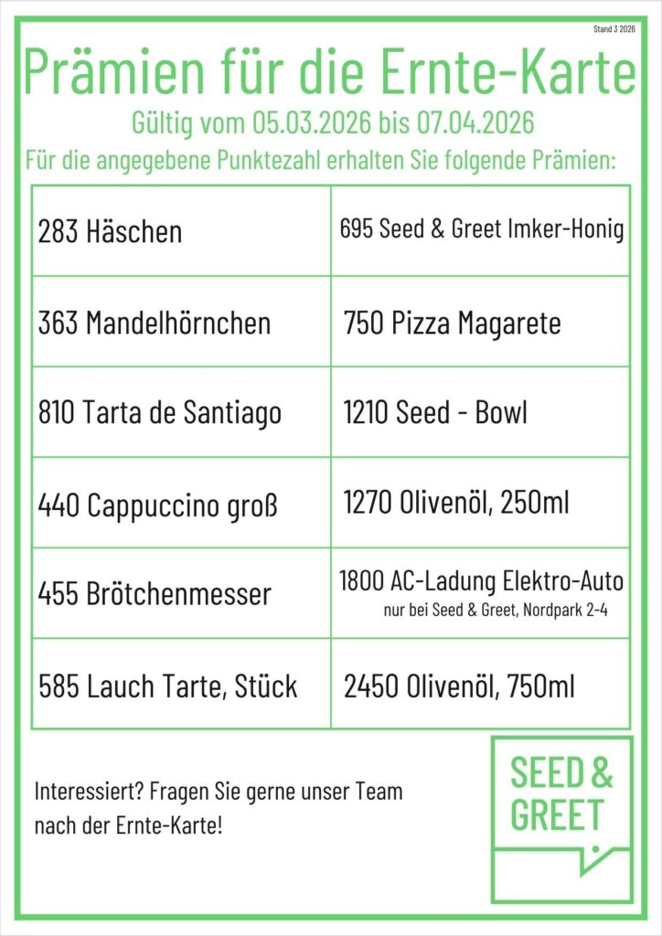 Sprechen Sie das Verkaufspersonal in der Filiale vor Ihrem nächsten Einkauf auf die Erntekarte an. Für 1,50 EUR können Sie diese dann erwerben und erhalten als Dankeschön bereits 150 Punkte Startguthaben. Mit diesem Startguthaben könnten Sie zum Beispiel bald ein leckeres Croissant au Chocolat ernten. Oder aber Sie sammeln weiter und ernten zu einem späteren Zeitpunkt ein super scharfes Solinger Brötchenmesser, eine kostenlose AC-Ladung oder ein hochwertiges Olivenöl von Jordan.
